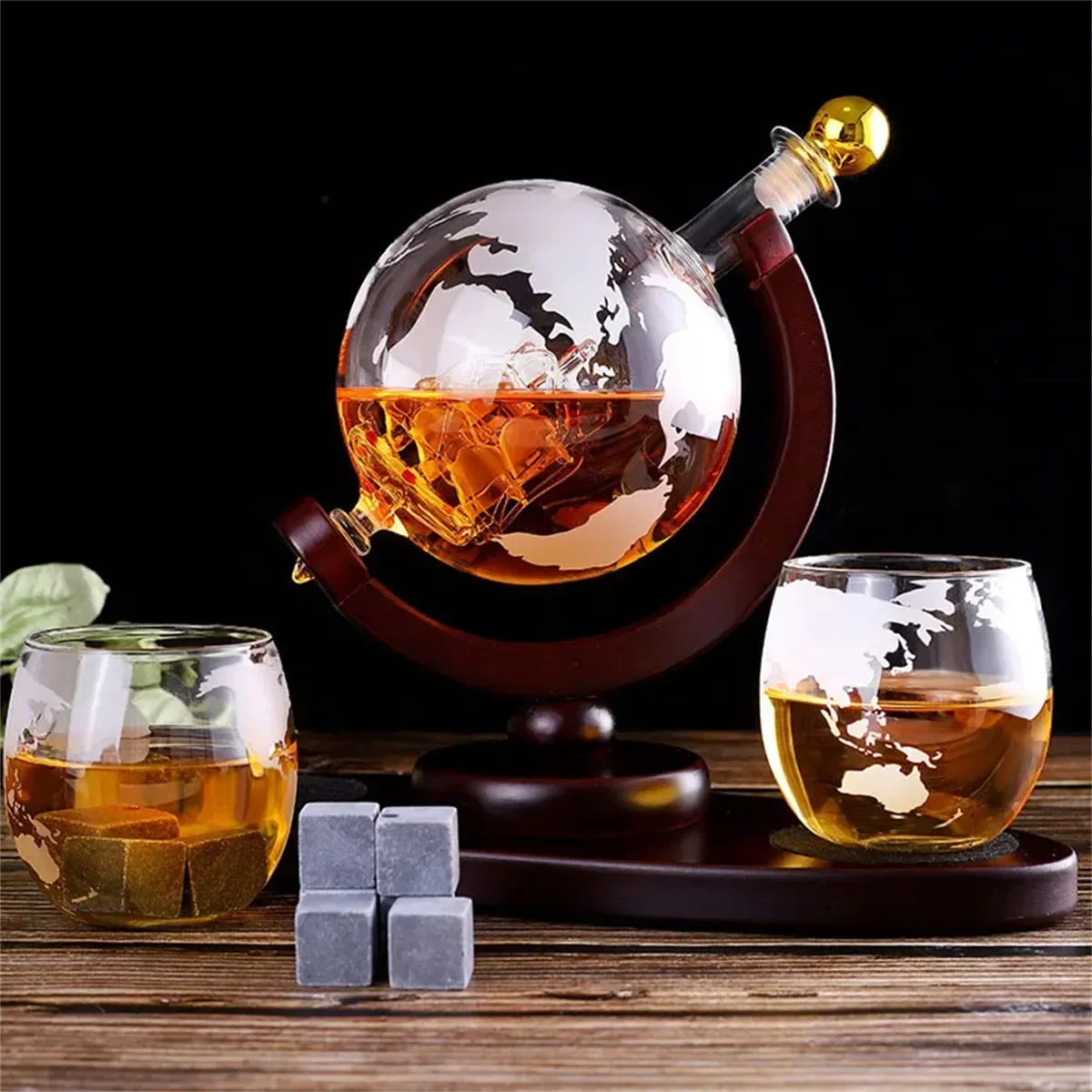 Hand-blown globe decanter with etched glasses and reusable whiskey stones. Feels more like home décor than promotional merchandise.