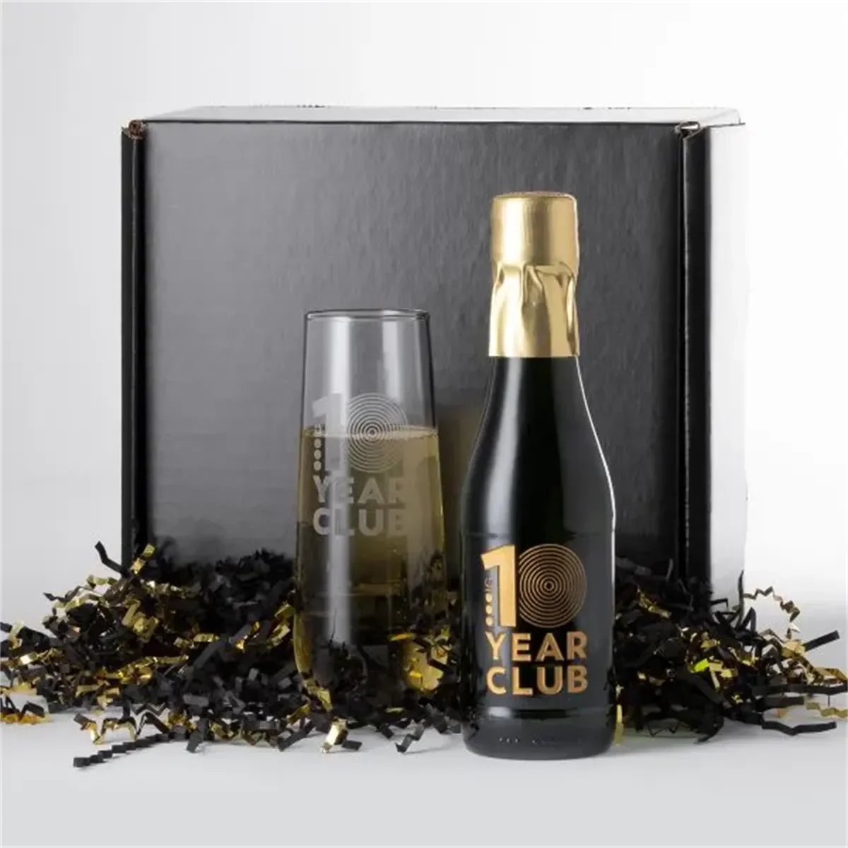 A compact sparkling wine gift set with a stemless flute. Clean presentation that works well for launches, renewals, and milestone moments. This set also offers name brand and non-alcoholic sparkling options.