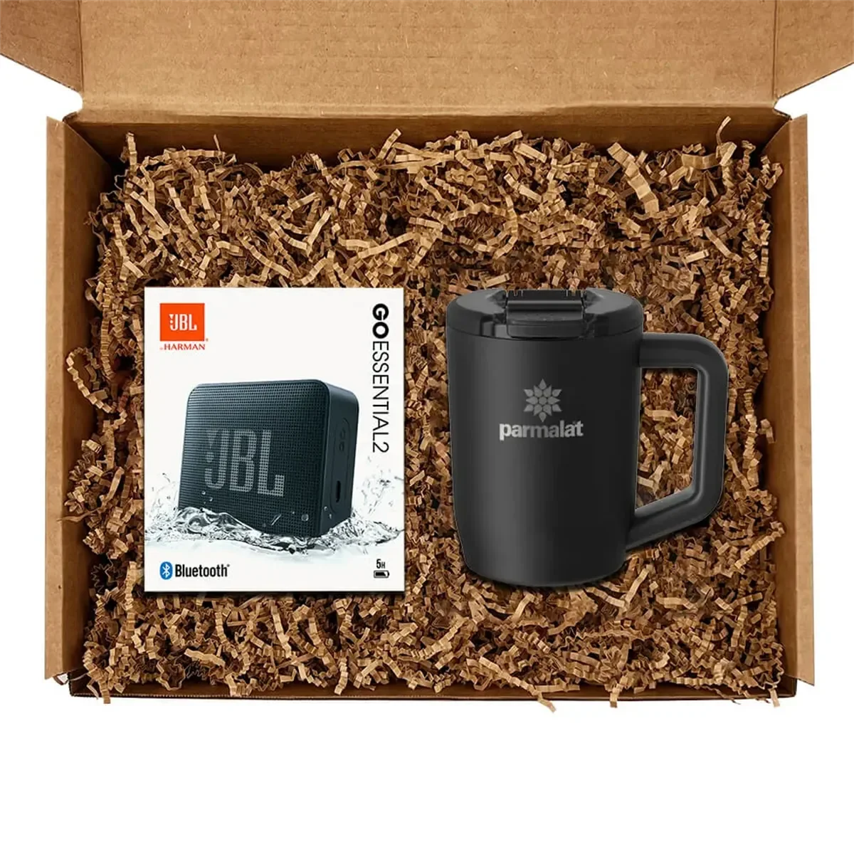 Insulated handled BruMate mug paired with a JBL compact waterproof Bluetooth speaker. Practical, design-forward, and ideal for daily use at home or the office.