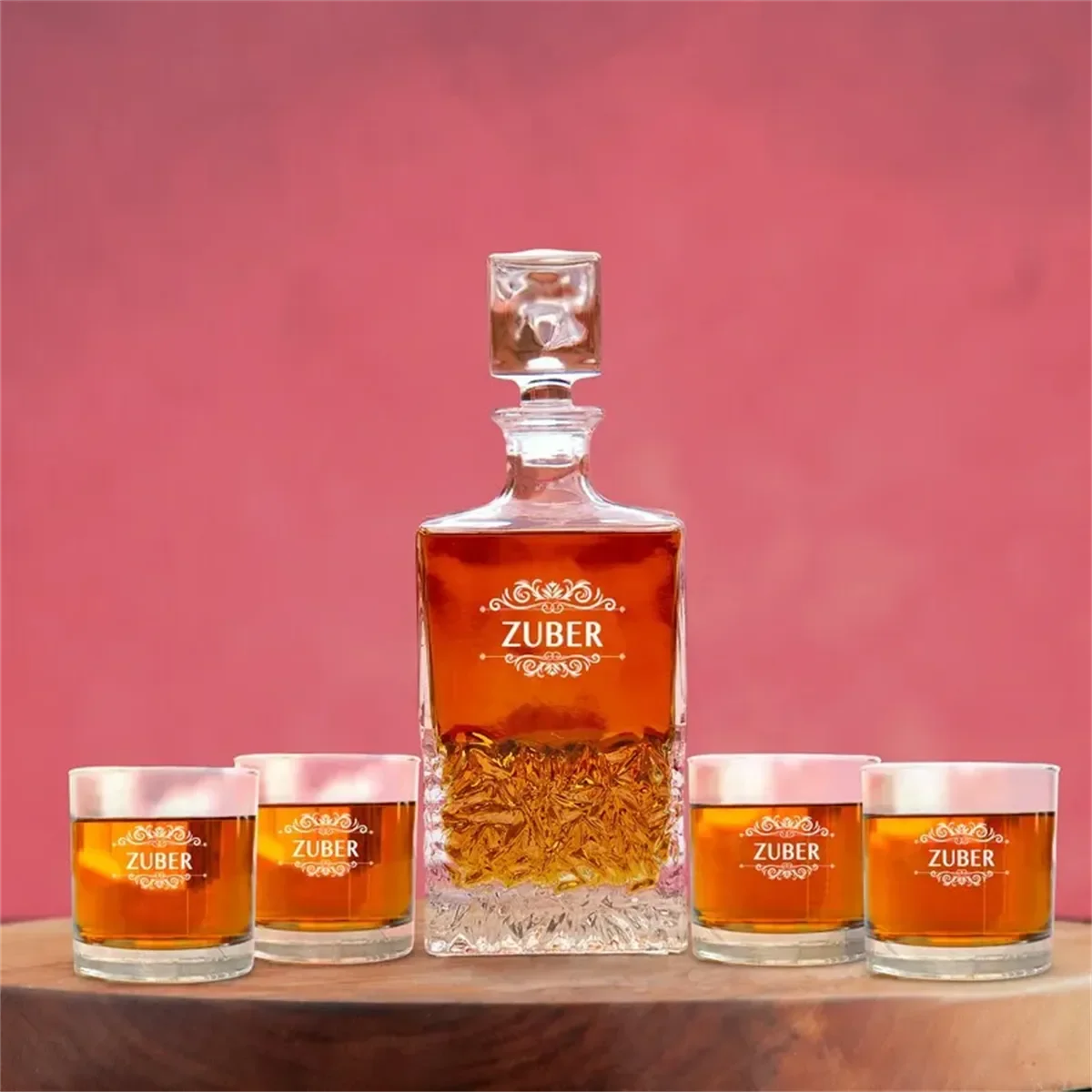 Engraved decanter and matching glasses gift set with 1 decanter and 2 glasses. Solid hand-polished all-glass stopper preserves whiskey's original flavor for longer, 25 oz (750 ml) capacity.